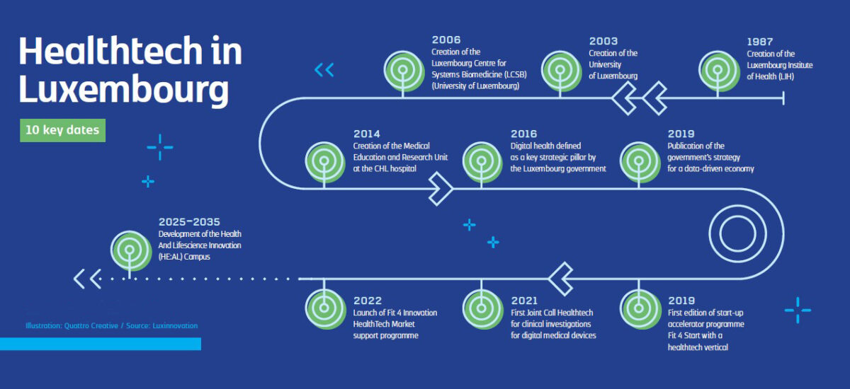 Der luxemburgische Gesundheitssektor präsentiert sich als junge, schnell wachsende Industrie mit etwa 150 Unternehmen, die sich der Entwicklung von digitalen Gesundheitsprodukten, -dienstleistungen und -tools verschrieben haben. Die Akteure des luxemburgischen HealthTech-Sektors profitieren von der Expertise und den fortschrittlichen Infrastrukturen der Informations- und Kommunikationstechnologien (IKT) des Landes und konzentrieren ihre Bemühungen auf Innovationen in den Bereichen E-Gesundheit, Apps, mobile Technologien und Systeme für die Verwaltung von Gesundheitsdaten. Das Ziel besteht darin, internationale Tragweite in der personalisierten Medizin zu erreichen und eine bessere Vorsorge und effizientere Diagnostik und Behandlung zu fördern.