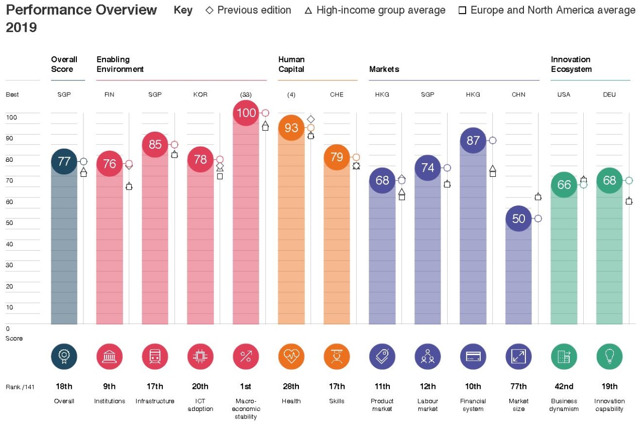 Bei dem Global Competitiveness Index handelt es sich um einen zusammengesetzten Index, in den 103 verschiedene Indikatoren, aufgeteilt auf 12 Säulen, einfließen: Institutionen, Infrastruktur, Fähigkeit zur Integration von Technologien, makroökonomische Stabilität, Gesundheit, Bildung und Kompetenzen, Gütermarkt, Arbeitsmarkt, Finanzsystem, Marktgröße, Dynamik der Unternehmen und Innovation. Jeder Indikator, auf einer Skala von 0 (schlechteste Leistung) bis 100 (beste Leistung), zeigt, wie weit eine Wirtschaft von der Idealsituation entfernt ist.