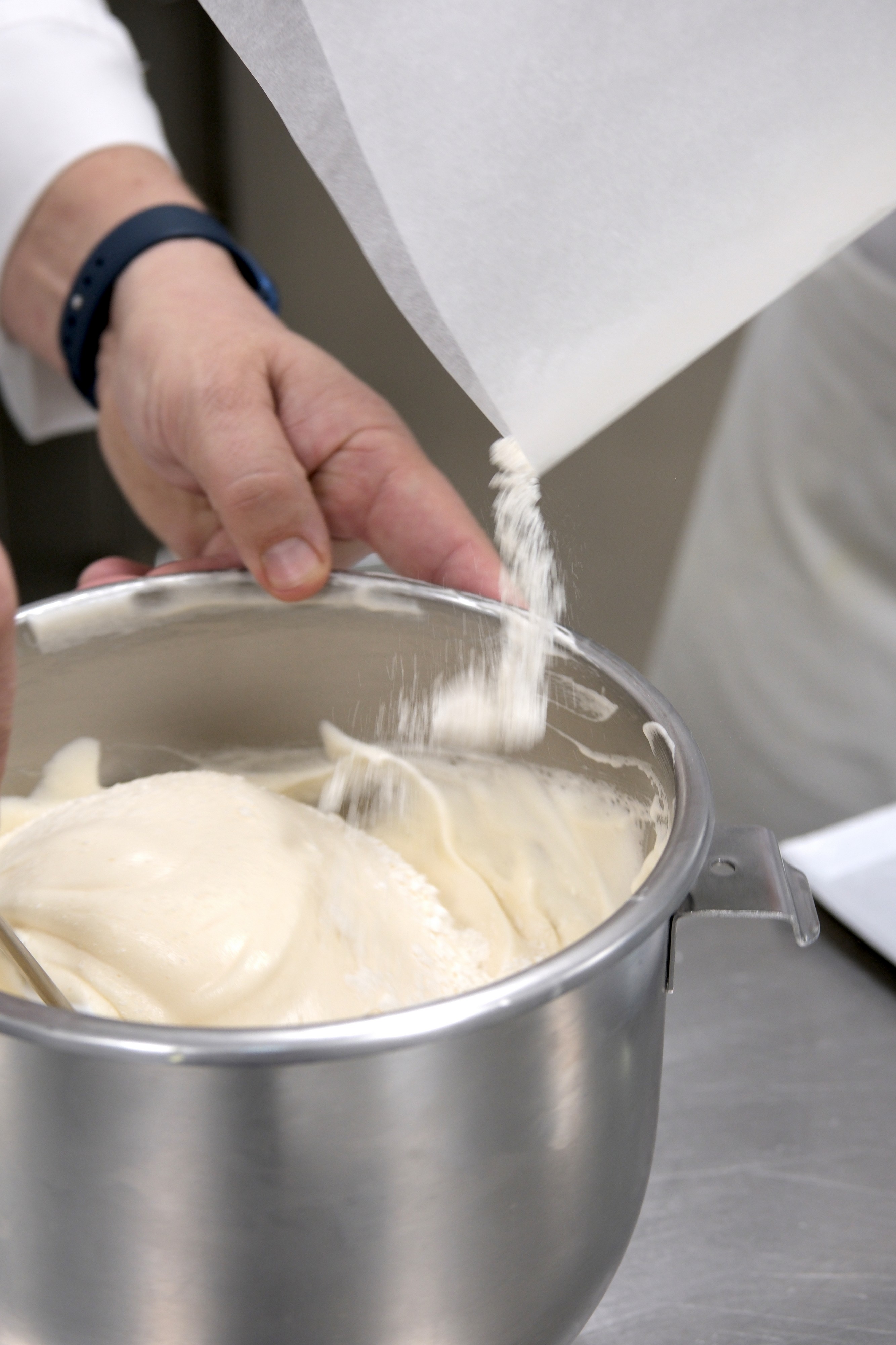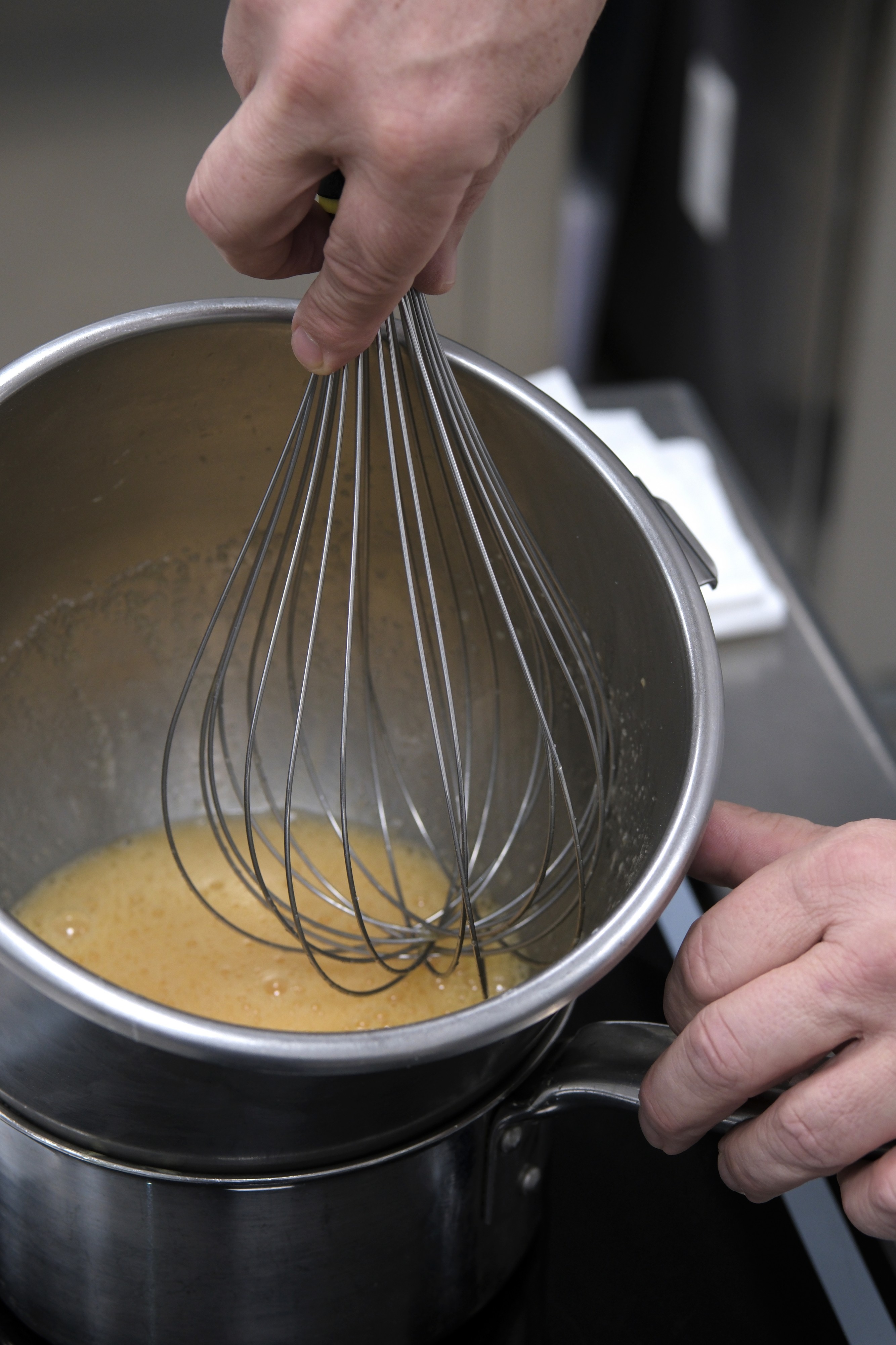 - Heat the egg-sugar mixture in a bain-marie to 37°C and whisk while cold until the biscuit forms a ribbon