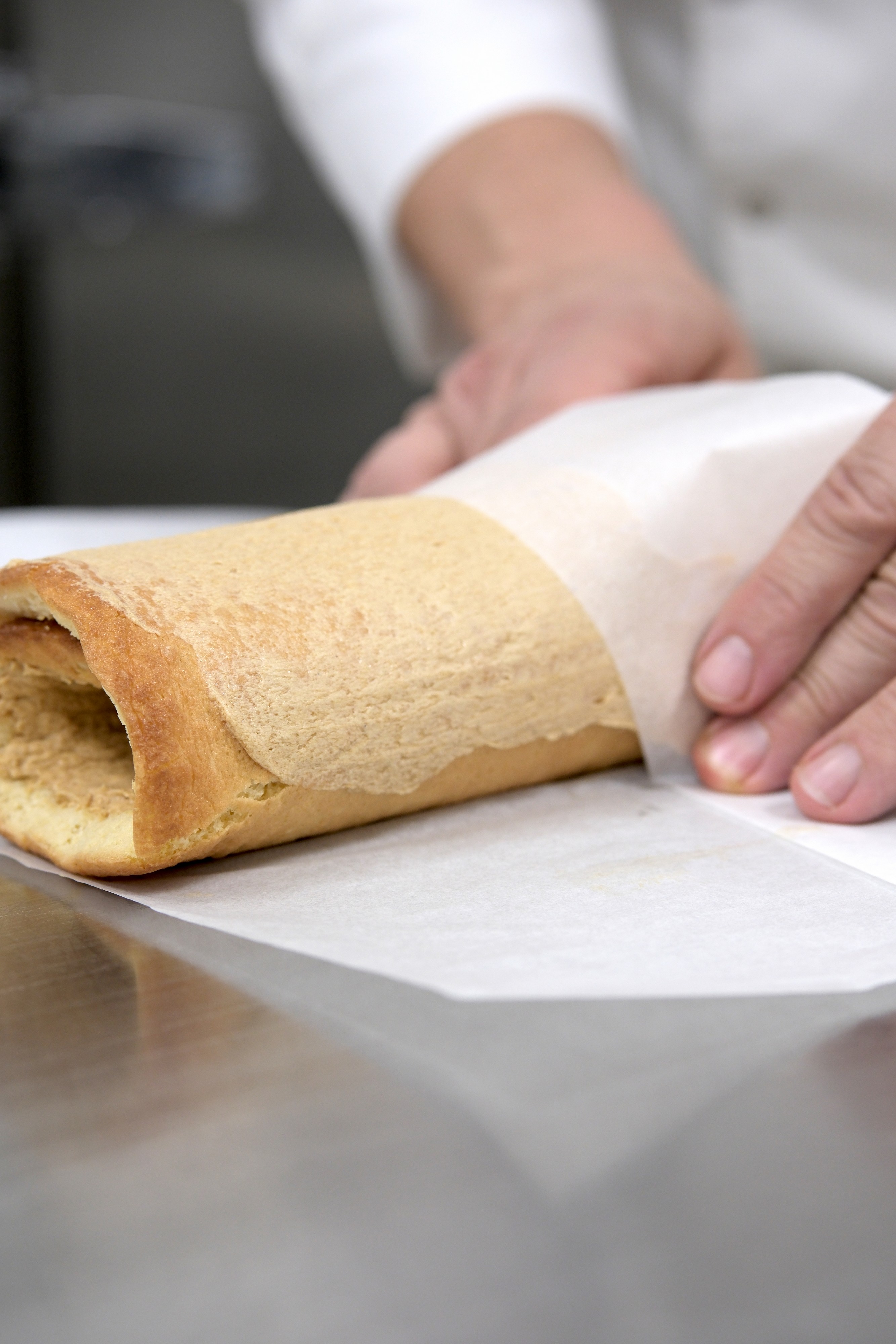 - Remove the biscuit from the hot baking tray, unload it to a tea towel and roll it up