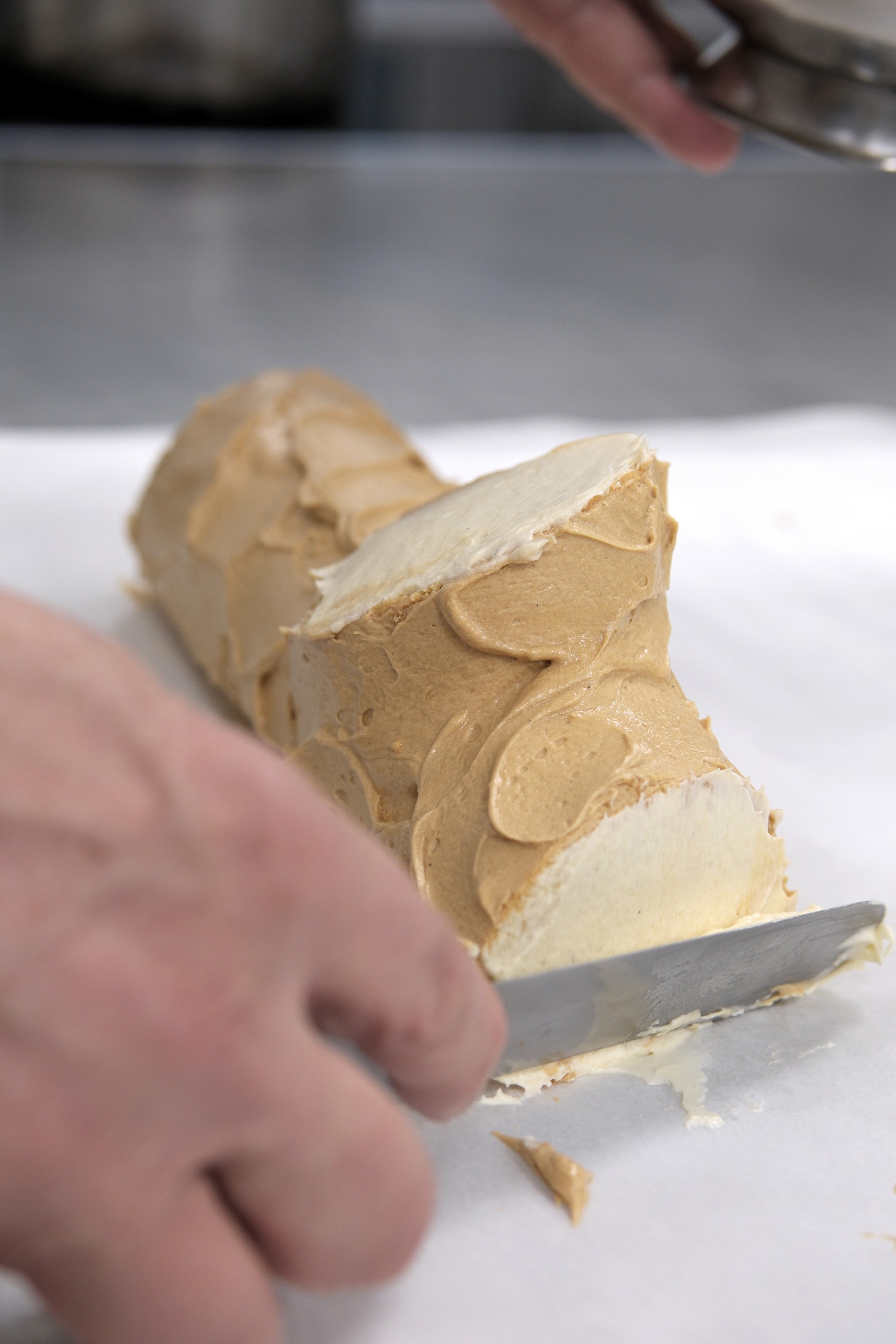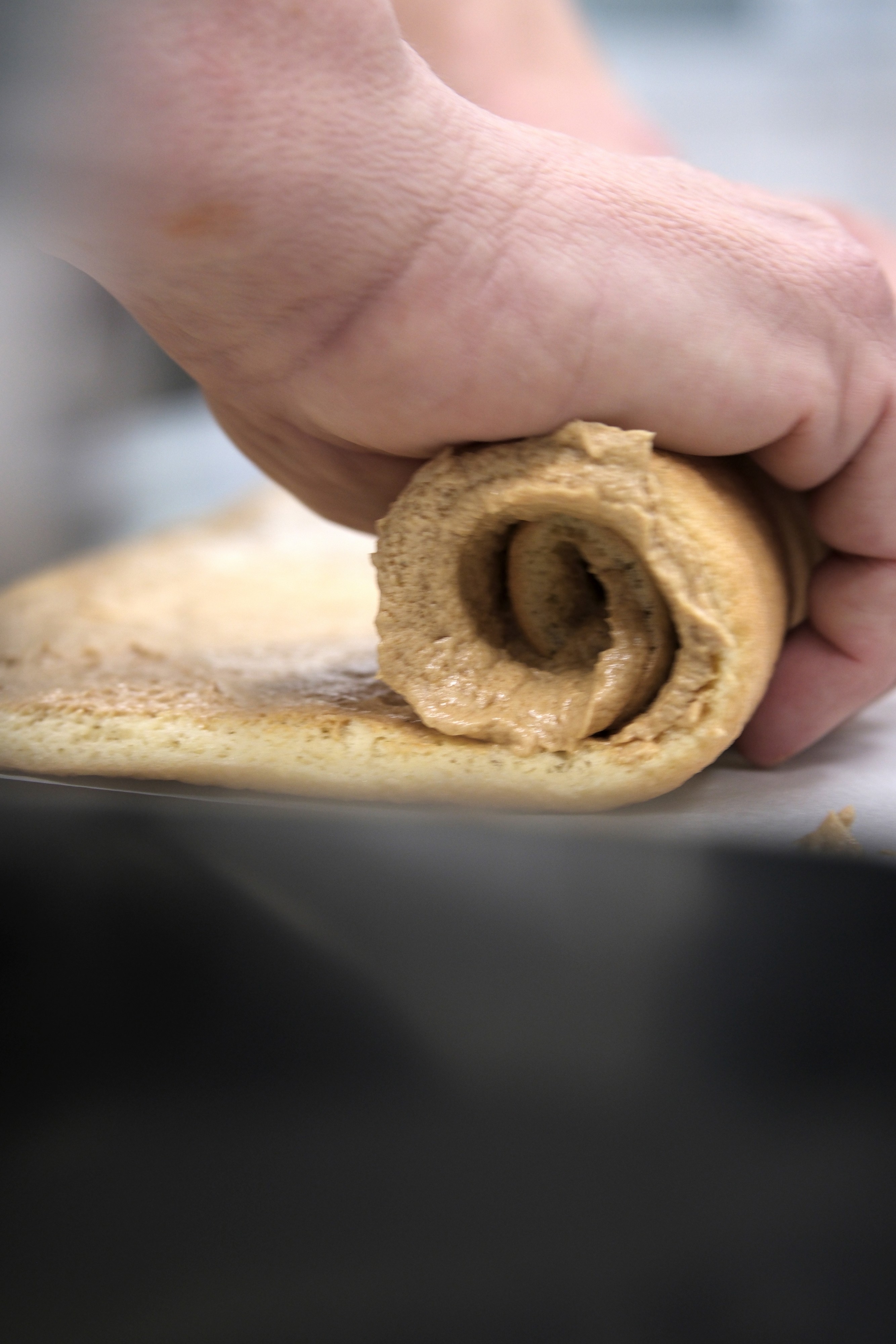 - Roll and tighten the biscuit with the buttercream and avoid hollows inside the log
