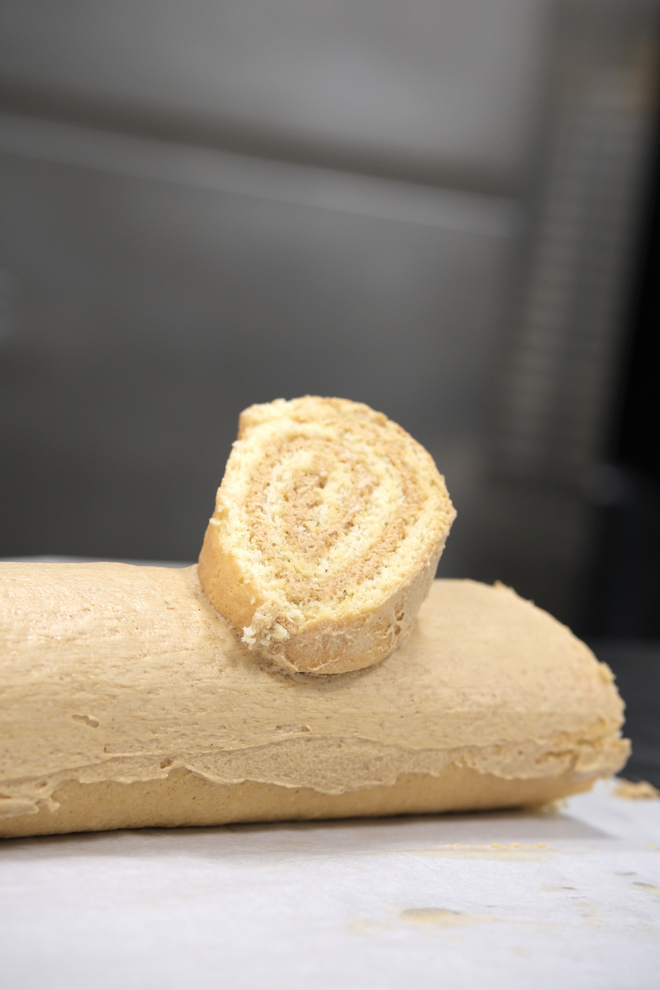 - Rouler et serrer le biscuit avec la crème au beurre et éviter d'avoir des creux à l'intérieur de la bûche