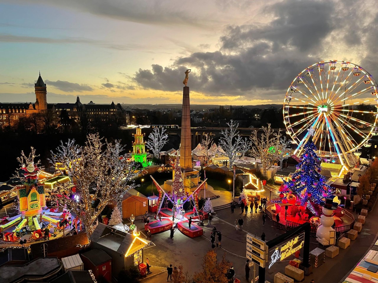 Au pied de la Gëlle Fra une quarantaine d'étals proposent une large gamme de spécialités culinaires salées et sucrées typiques, de la décoration ainsi que des produits artisanaux. Des manèges, des espaces gastronomiques, un sapin doré de 13 mètres de hauteur, une grande roue de 32 mètres avec vue panoramique sur la vallée de la Pétrusse et le pont Adolphe, transforment la place en village festif.